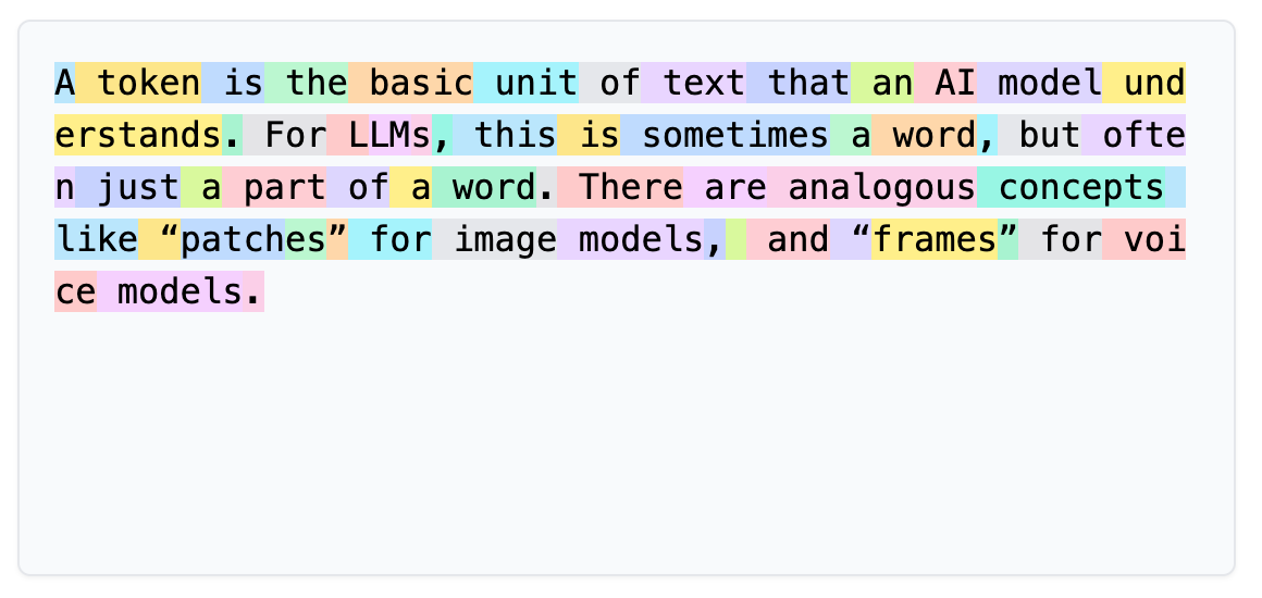 A token is the basic unit of text that an AI model understands. For LLMs, this is sometimes a word, but often just a part of a word. There are analogous concepts like “patches” for image models and “frames” for voice models.