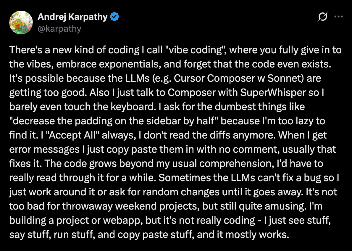 Vibe coding has come to mean building apps using AI tools like Cursor, Windsurf, Bolt, Lovable, v0, or Replit, by describing what you want in plain English (i.e. prompts) rather than writing code. In many cases, you never look at the code at all.